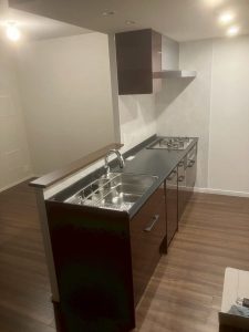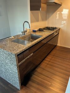 今回のキッチン、ワークトップ(天板)に目地がなく、サイズが2165㎜×655㎜と長物の搬入となりました。